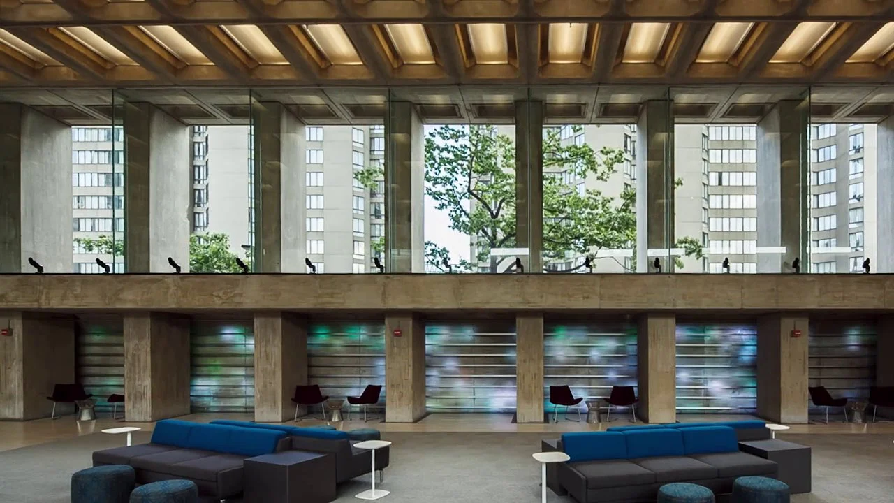 Employing custom low resolution LED fixtures reflecting off the Brutalist concrete allowed the team to honor the architect's intent and materiality while introducing dynamic color and motion to the space. Local weather and other real time feeds are reinterpreted by AV&C's software into soft glowing motion that animates the new lobby seating area.