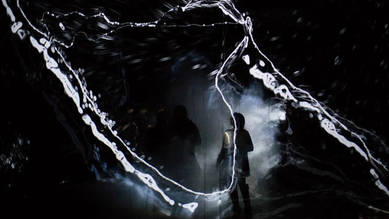 In the center of an unlit 6,000-square-foot warehouse, waves of liquid light undulate wistfully across the walls of a semitransparent triangular structure. Simple rules shape this ever-evolving animation, giving rise to organic abstracted patterns with complex behavior that teeter between order and chaos. Immersed in layers of distant melodies that reverberate in sync with the surging fluid, as well as in a dense plume of fog that extends and blurs the light within, visitors dip in and out of the sculpture as if in a dream.